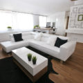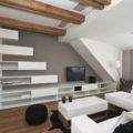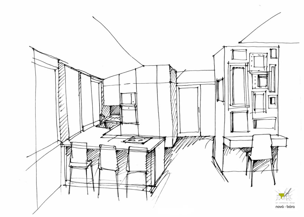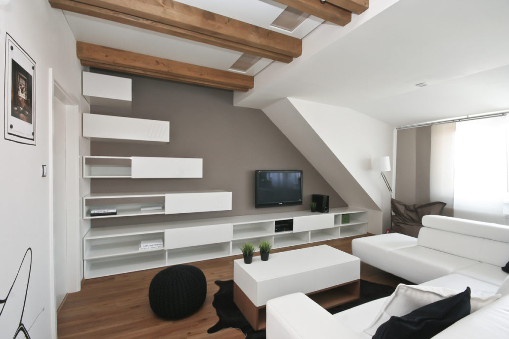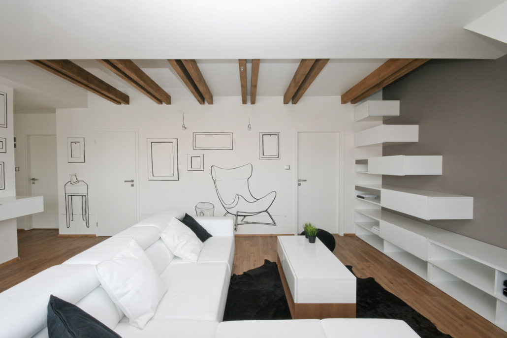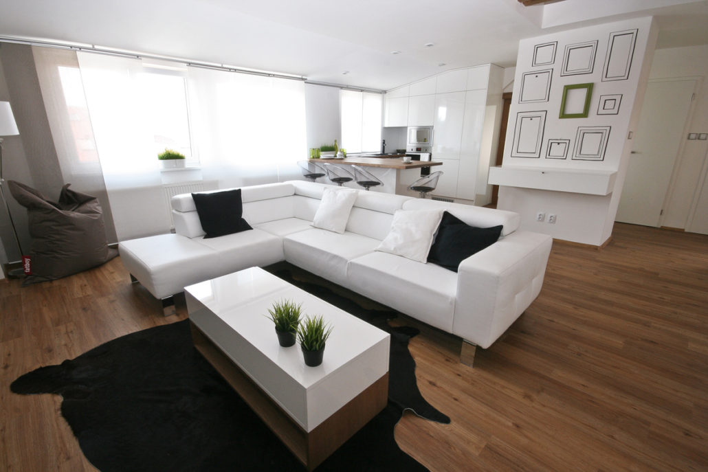 Požadavek zákazníka byl kombinace bílé se dřevem, pracovní deska u kuch. linky masiv, zavěšené skříňky u TV pochůzné,